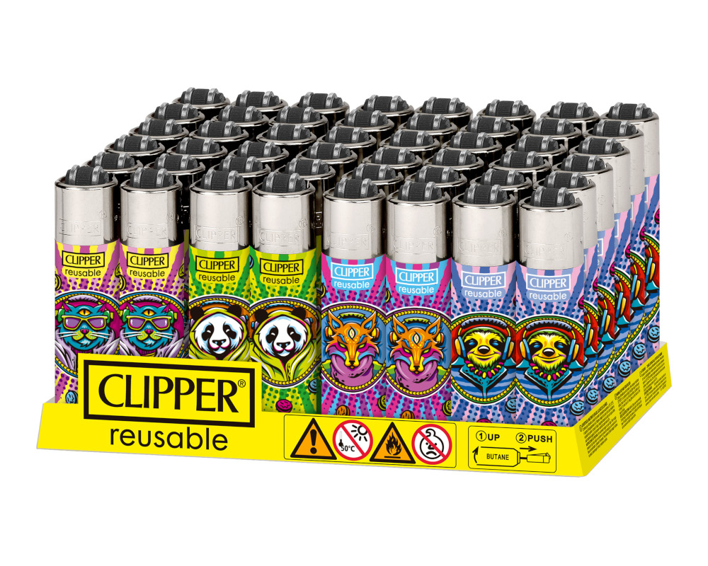 Colección Micro Rave Animals de Clipper, bandeja de 48 encendedores con garantía de 3000 encendidos (según fabricante) en cada uno de sus mecheros.