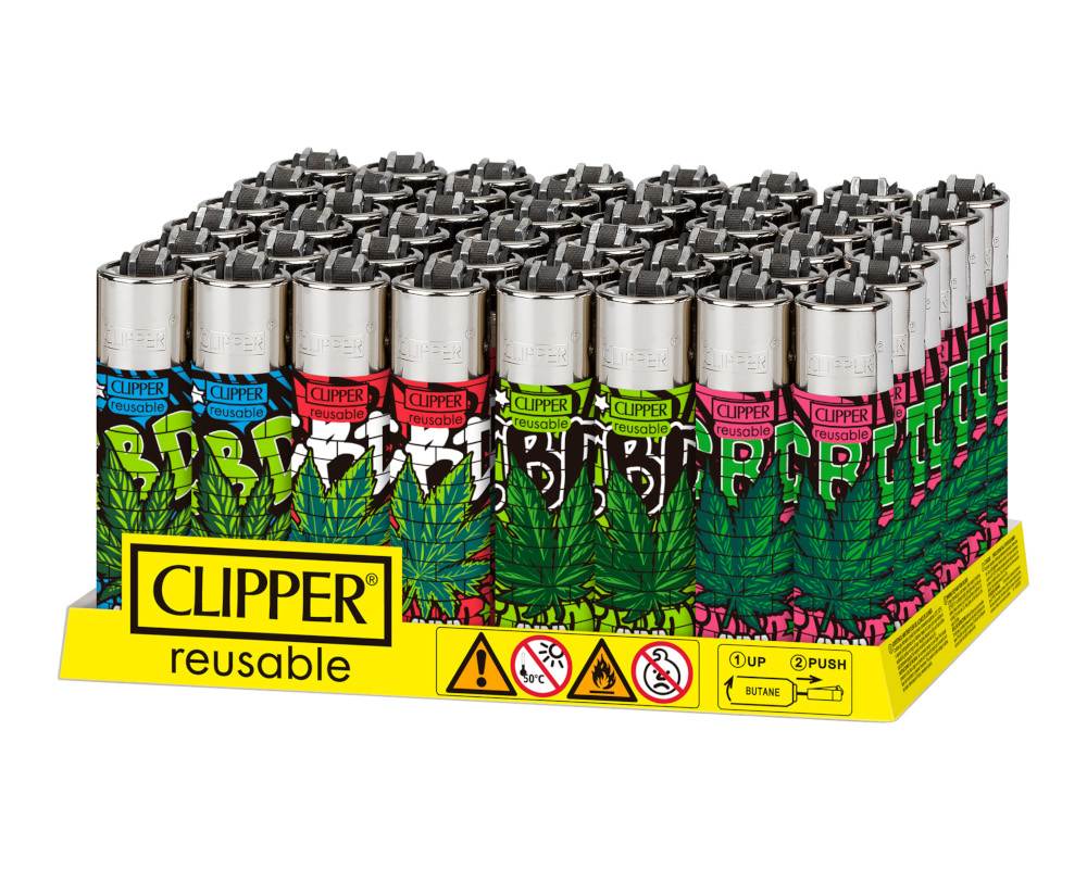 Colección Weed2 de Clipper. Bandeja de 48 encendedores con garantía de 3000 encendidos (según fabricante) en cada uno de sus mecheros.