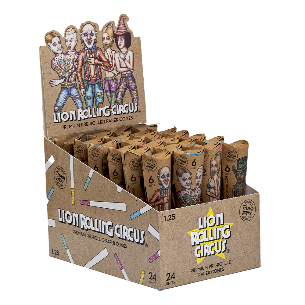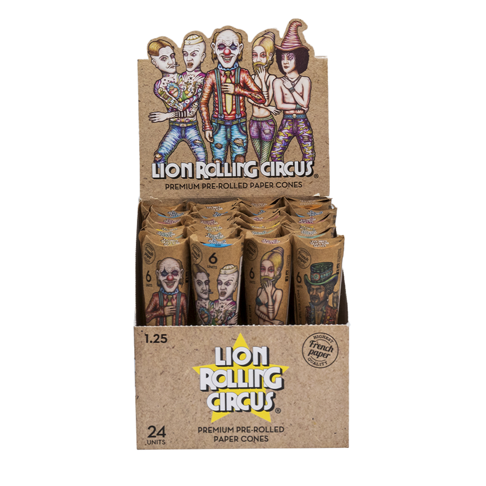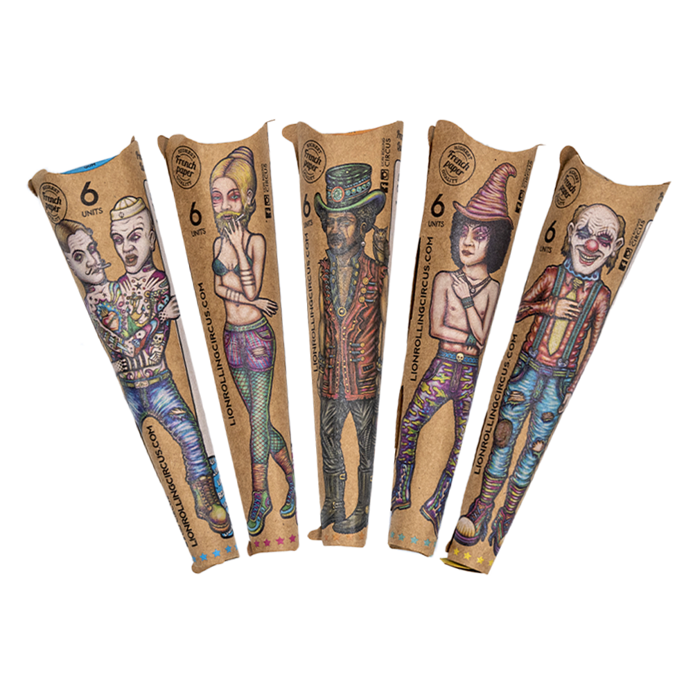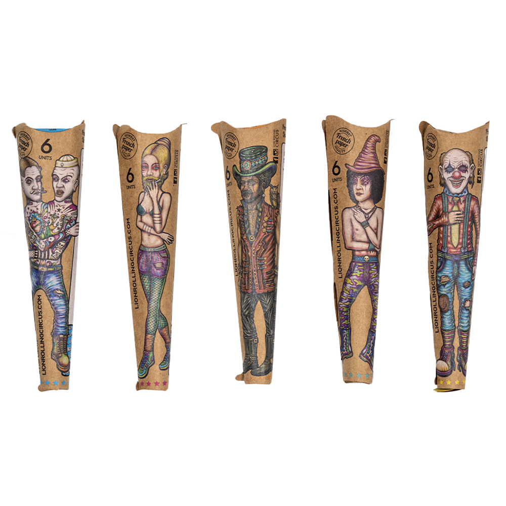 Conos by Lion Rolling Circus, de tamaño 1 ¼, creados con papel francés, hecho 100% de fibra de madera que no ha pasado por el proceso de blanqueado, maximizando el disfrute del humo y reduciendo el impacto ambiental. Proporciona una agradable combustión media, goma orgánica.