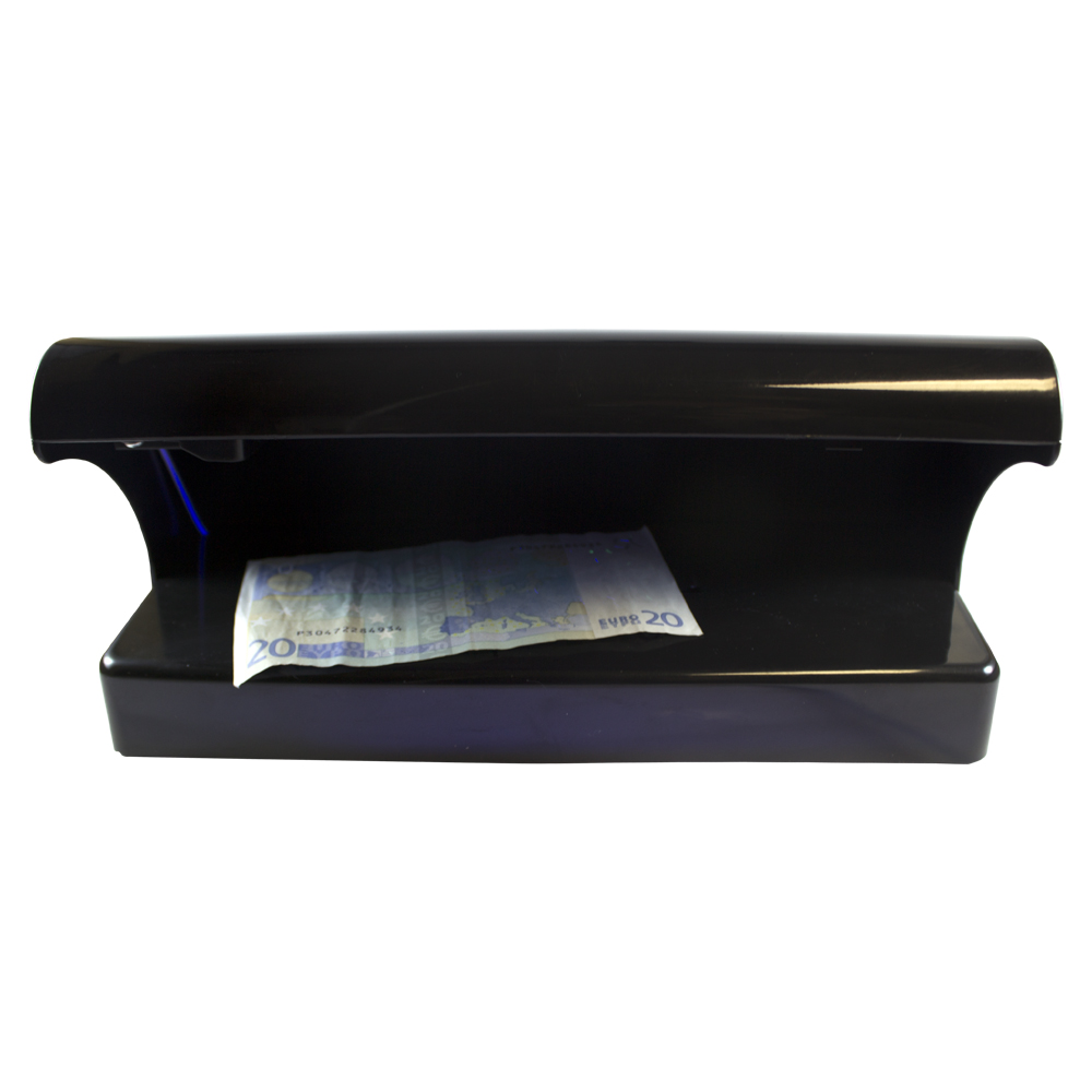 - Este detector de billetes falsos utiliza tecnología ultravioleta y magnética.