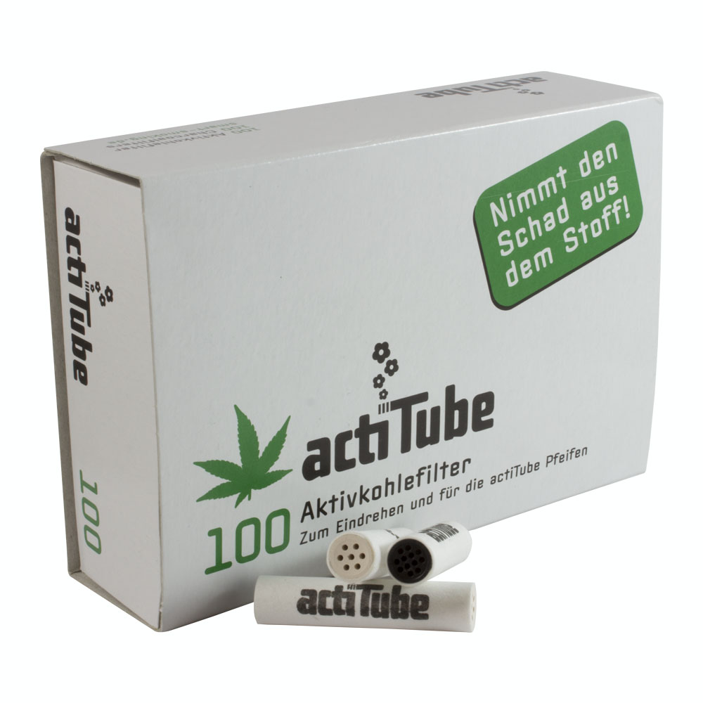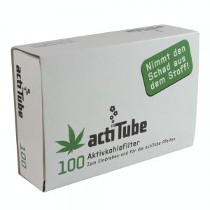 Filtros Actitube de carbón activado para liar, se encuentran disponibles en cajitas de tres tamaños: 10, 40 y 100 piezas.