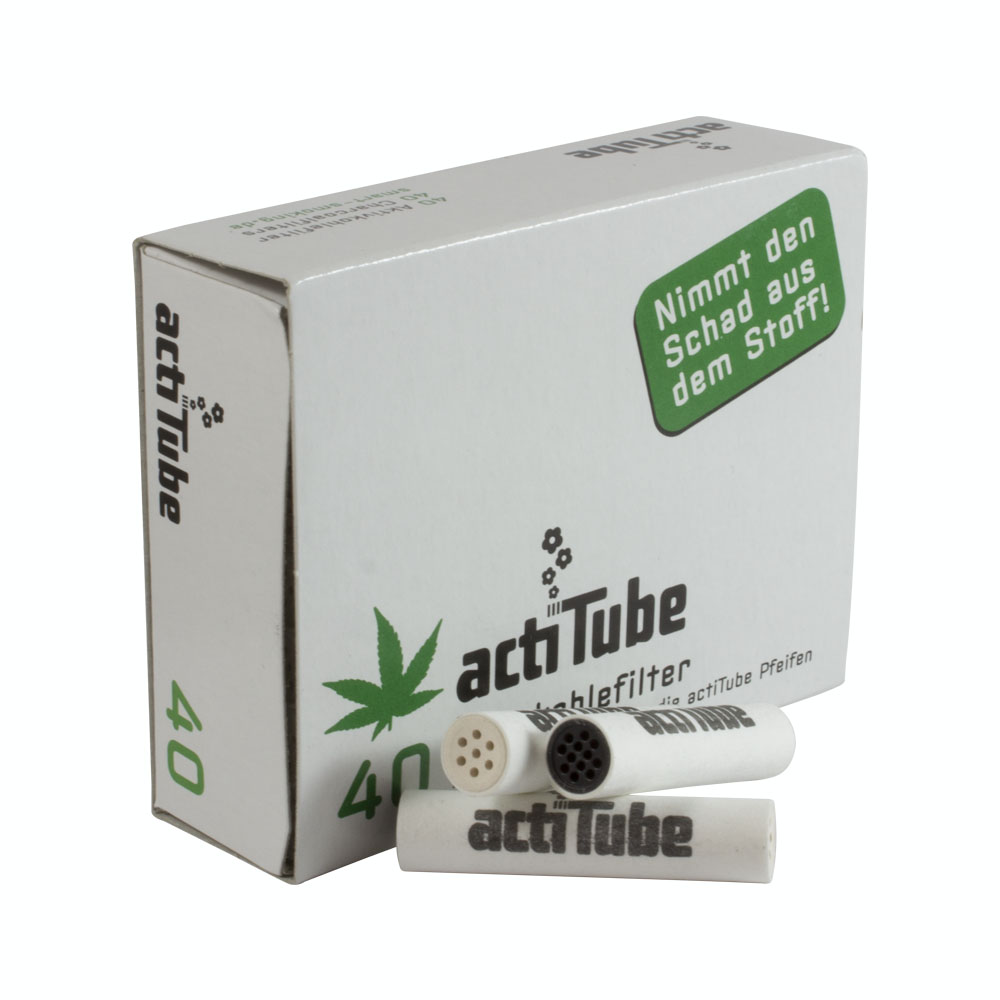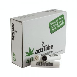 Filtros Actitube de carbón activado para liar, se encuentran disponibles en cajitas de tres tamaños: 10, 40 y 100 piezas.