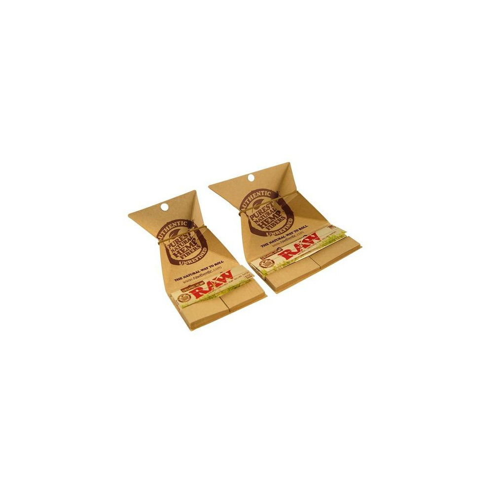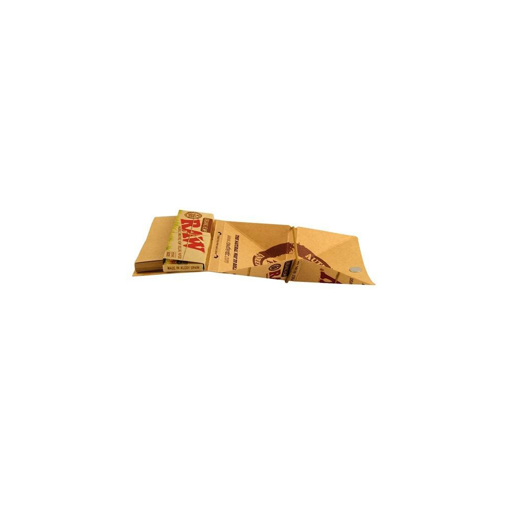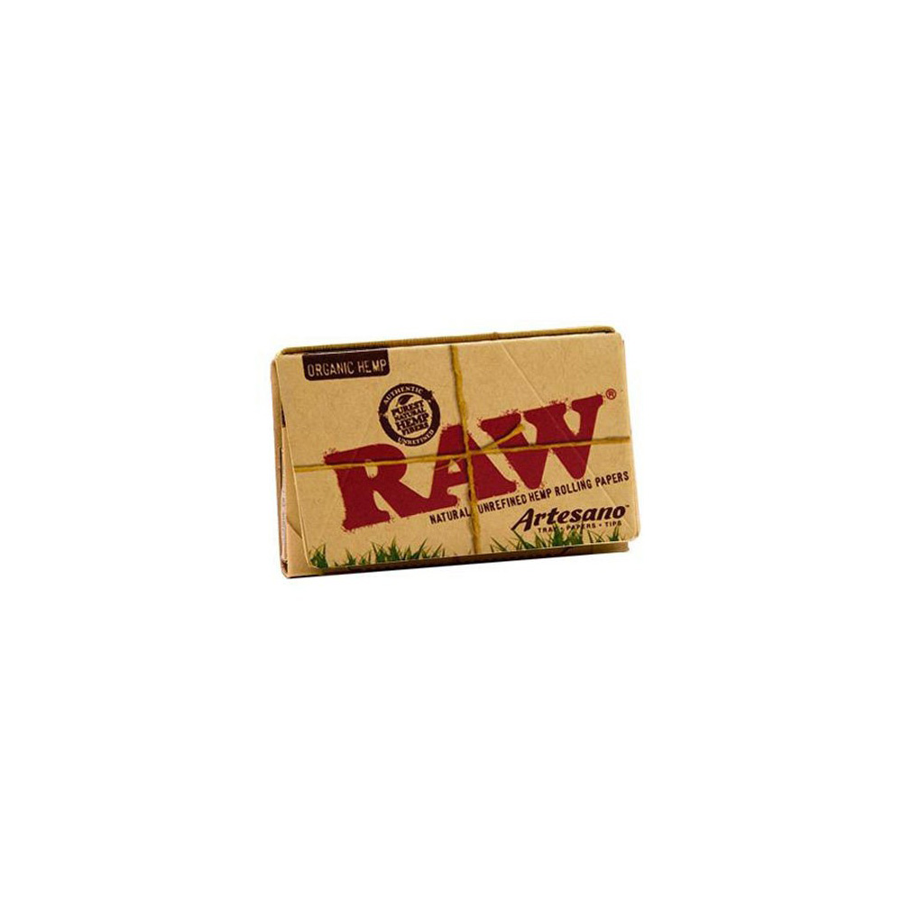 Los paquetes del papel Raw Artesano 1 ¼ cuentan con un librillo de Raw Organic 1¼ con 50 papelillos, treinta y dos boquillas o «tips» de cartón y una pequeña bandeja muy práctica para mezclar tus tabacos favoritos.